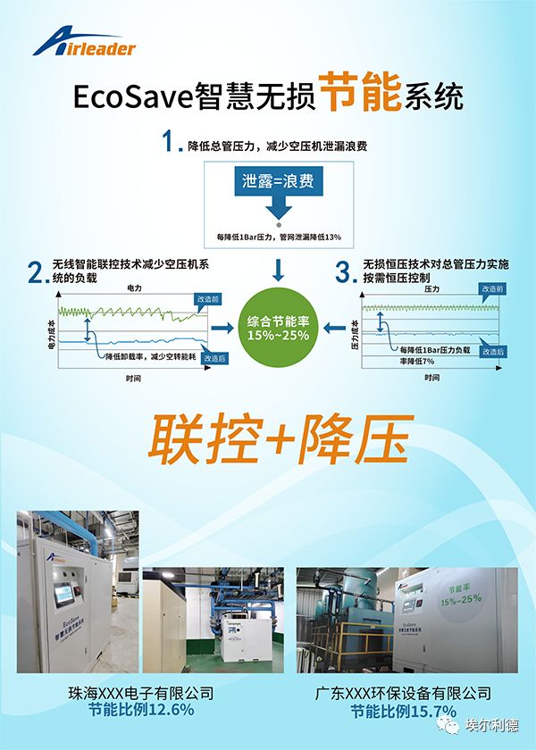 ? ? ? ?EcoSave智慧無損節(jié)能系統一方面通過采集壓縮空氣系統壓力波動,將數據上傳到云平臺,通過數據庫進行生產用氣規(guī)律的深度學習,精確預測未來用氣規(guī)律,并通過AI無損恒壓技術進行精確匹配,降低系統壓力和空壓機卸載時間,綜合節(jié)能比例達到15%-25%,實現系統節(jié)能降耗。