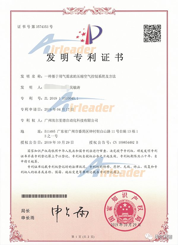 近期,埃爾利德自主研發(fā)的“一種基于用氣需求的壓縮空氣控制系統及方法”技術通過國家知識產權局的審查,被授予發(fā)明專利權并頒發(fā)專利證書,專利號為ZL 2019 1 0310045.1,再一次刷新了壓縮機行業(yè)整體節(jié)能的高度。